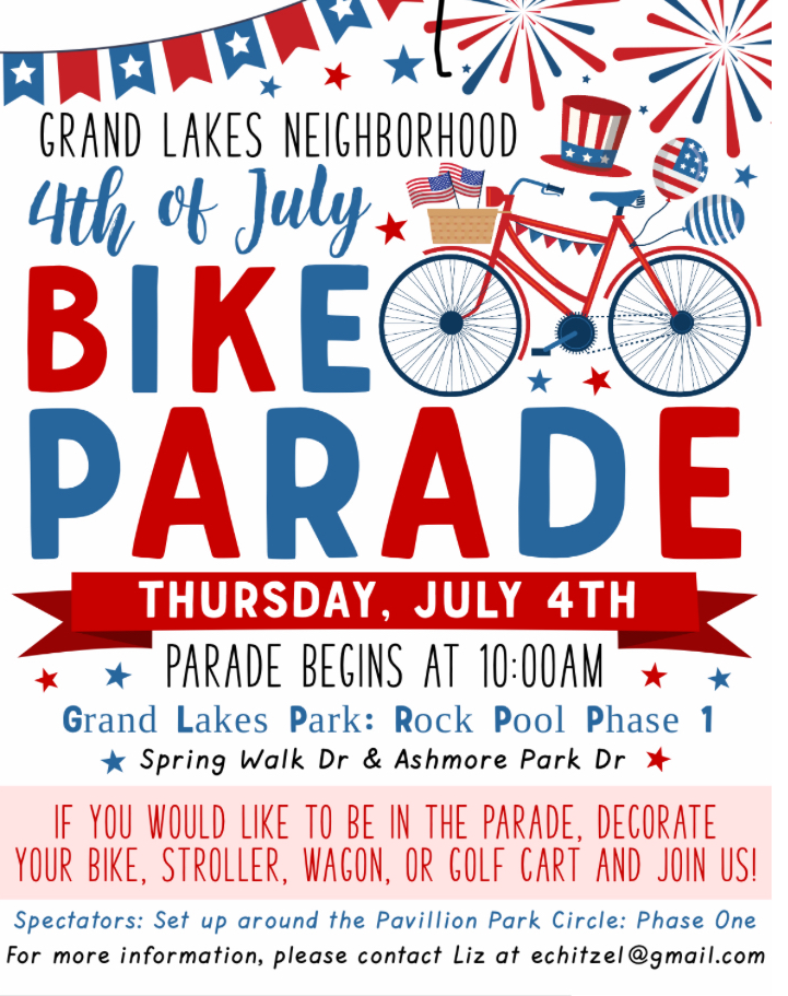 Join us for the Grand Lakes neighborhood 4th of July Bike Parade! Get your bikes, strollers, wagons and golf carts ready! On Thursday, July 4, we will meet at the Grand Lakes Park: Rock Pool Phase 1 at 10:00 AM. Spectators are invited to set up around the Pavilion Park Circle Phase 1. For more information, contact Liz at echitzel@gmail.com.