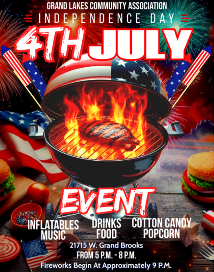 Then later in the evening, join us at 21715 W. Grand Brooks from 5:00 to 8:00 PM for inflatables, music, drinks, food, cotton candy and popcorn, with fireworks starting at 9:00 PM! You won't want to miss this fantastic event!