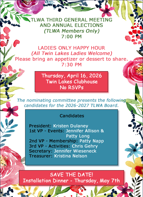 The Twin Lakes Women’s Association (TLWA) will hold its Third General Meeting and Annual Elections on Thursday, April 16, 2026, at 7:00 PM at the Twin Lakes Clubhouse. This is a members-only meeting where the nominating committee will present the official slate for the 2026–2027 TLWA Board — and members will vote. That vote determines who manages TLWA events, membership outreach, activities and the association’s finances for the coming year, so it has direct impact on how clubhouse programming, neighborhood gatherings and membership services are run.