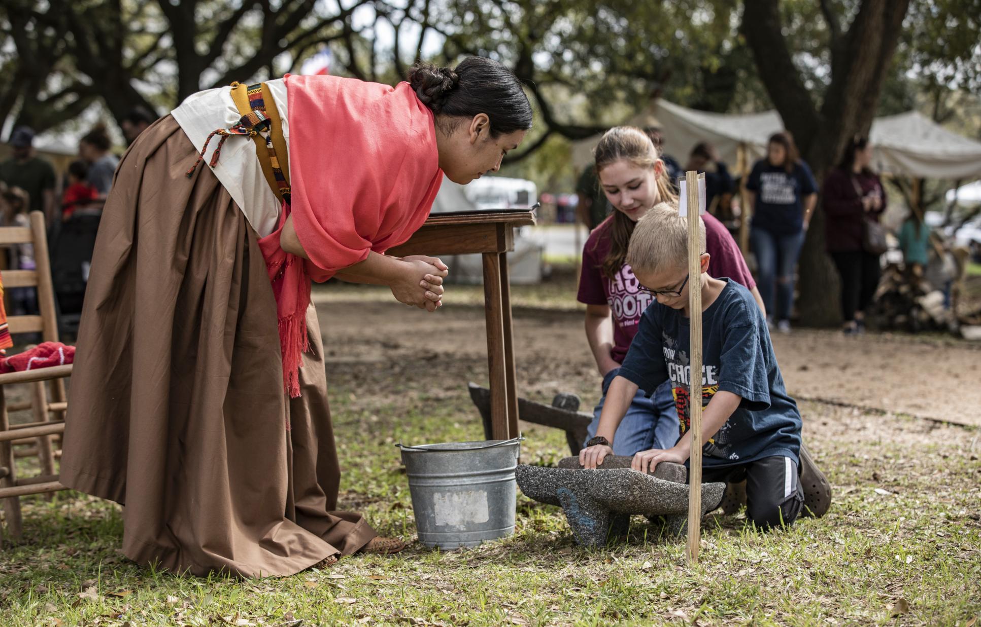 A young visitor tries his hand at traditional corn grinding during an interactive living history demonstration at Washington-on-the-Brazos State Historic Site, where costumed interpreters bring the Republic of Texas era to life.