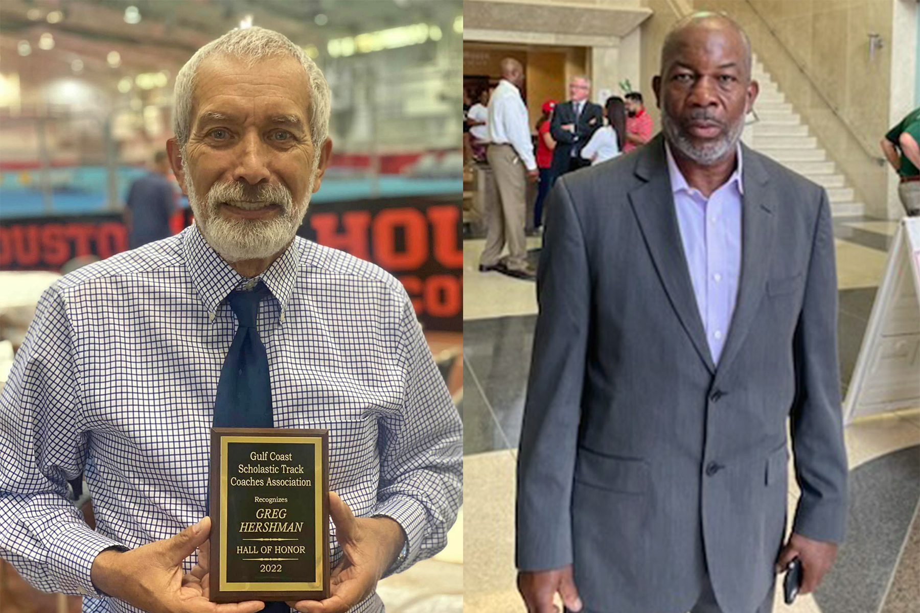 Former longtime CFISD track and field coaches Greg Hershman and Mike Long were recently inducted into the Gulf Coast Scholastic Track Coaches Association (GCSTCA) Hall of Honor, joining two fellow Class of 2022 honorees during the association’s 26th annual clinic on Dec. 10 at the University of Houston Athletics/Alumni Center.
