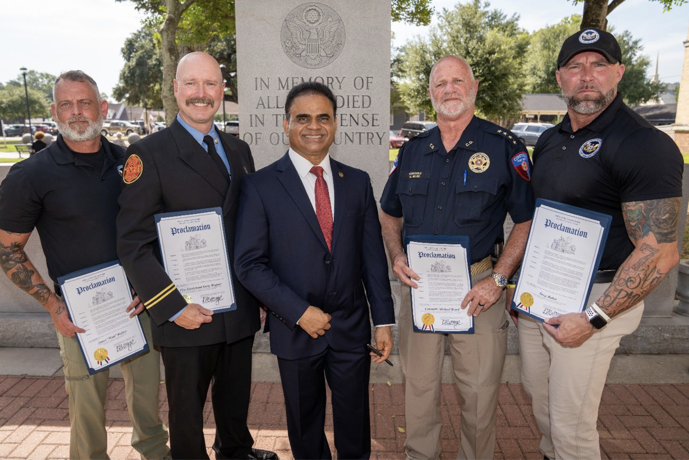 During the ceremony, Judge KP George extended special recognition to four outstanding Fort Bend County first responders for their remarkable service following 9/11. These individuals exemplify the unwavering commitment to public safety that defines Fort Bend County's first responders. The honorees are: