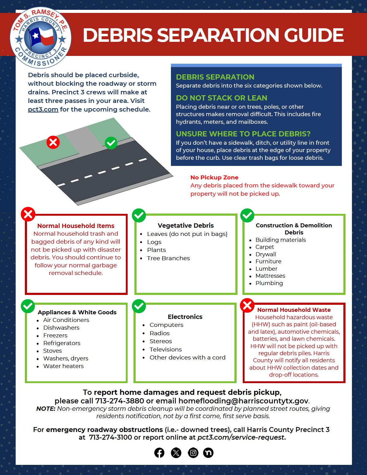 Unincorporated residents of Precinct 3 are not required to report their debris. All we ask is that you follow the debris separation guide below.