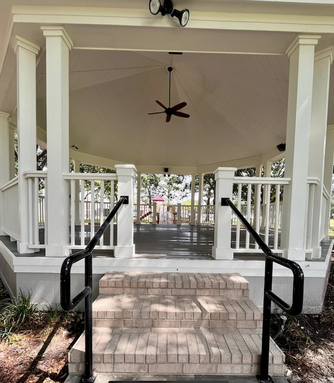 This Gazebo is located in the neighborhood of Greenway Terrace (the second section of Greenway Village). Home construction in this neighborhood started back in the 1990s and now has 303 residential homes. This neighborhoods old & well used wooden gazebo has now been replaced with a much needed upgraded gazebo prominently positioned within the greenbelt adjacent to Fielder Elementary.