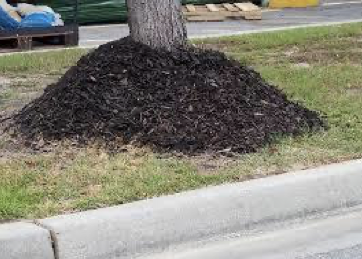 The “Mulch Volcano”: Piling up mulch in a hill against the trunk of your trees will eventually suffocate the roots near the surface of the soil in that area. The mulch volcano will hold moisture against the tree’s trunk which can lead to insect and pest disease problems.