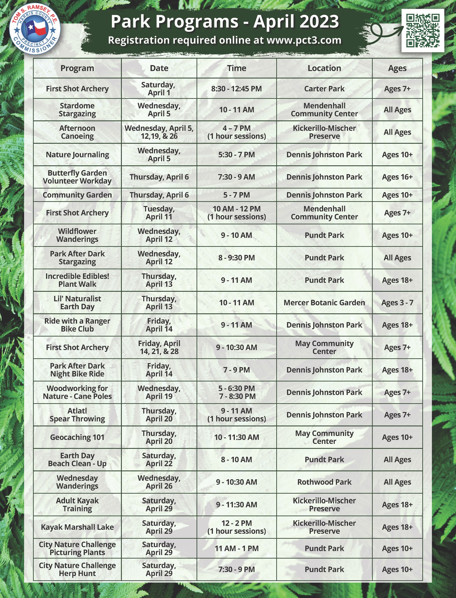 Your Harris County Precinct 3 Park Programs naturalists have a full lineup of programs for April! This month, HCP3 is offering a wide variety of outdoor recreation opportunities, including archery, spear throwing, and just as many nature-based programs like nature journaling, stargazing, and a wildflower hike.